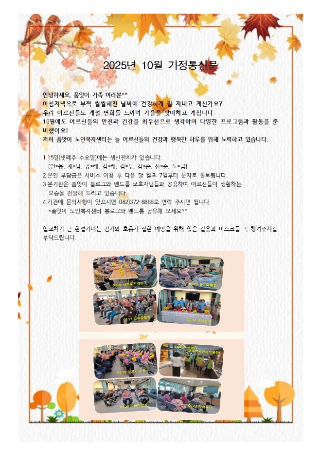 저희 품앗이노인복지센터는 어르신들께서 안전하고 즐겁게 하루를 보내실 수 있도록 다양한 활동과 정성 어린 돌봄을 준비하고 있습니다. 특히 환절기 건강관리에 더욱 세심한 관심을 기울이고 있으며, 보호자님들의 협조와 성원에 늘 감사드립니다. |